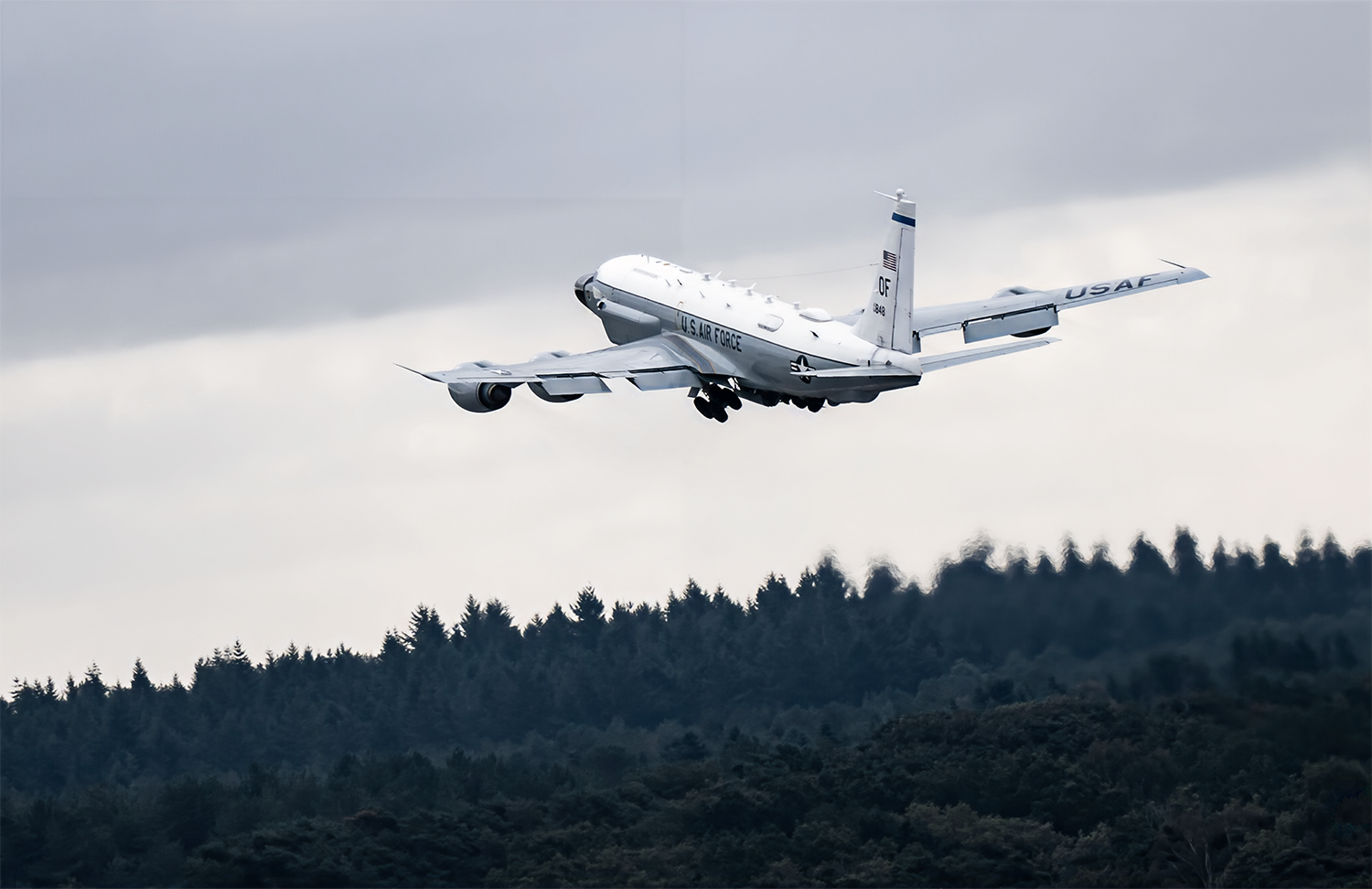 A U.S. Air Force RC-135 Rivet Joint, assigned to the 95th Reconnaissance Squadron, departs RAF Mildenhall, United Kingdom, Aug. 21, 2025. With 108 years of continuous service, the 95th RS stands as one of the oldest active units in the Air Force. Since its activation on Aug. 20, 1917, the squadron has carried out a variety of missions through nearly every major conflict, including its historic role as a bombardment squadron during the Doolittle Raid of 1942. (U.S. Air Force photo by Staff Sgt. Kevin Long)